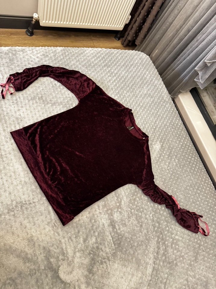 Bordo renkli, uzun kollu, salaş kesim hamile bluz. Drapeli tasarımı ve halter yakası ile romantik akşamlar için uygun, koyu renkli ve rahat bir goth tarzı sunar.
