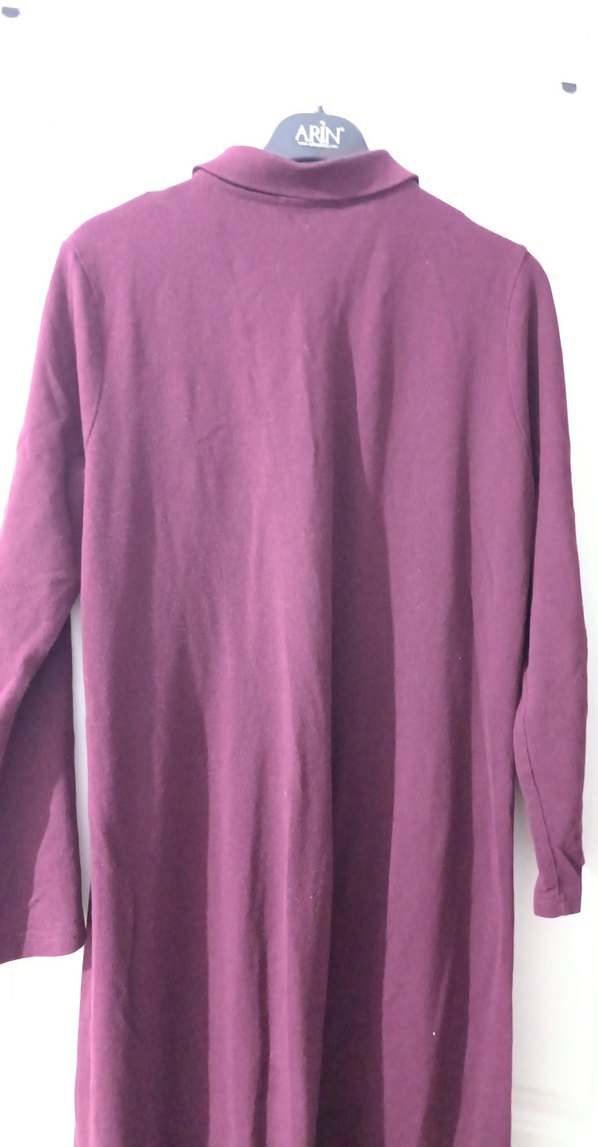 Bordo renkte, uzun kollu ve boğazlı kadın elbise. Yumuşak ve sıcak kumaştan, bol kesim ve uzun boyda, günlük kullanım için uygun. birkaç lekesi var resim çekerken fark ettim normalde hiç belli değildi ışıkta çok fazla görünüyor resim lerden sonra yıkayacagim leke çıkari ile. uzun tesettür koyu bordo renkte elbise