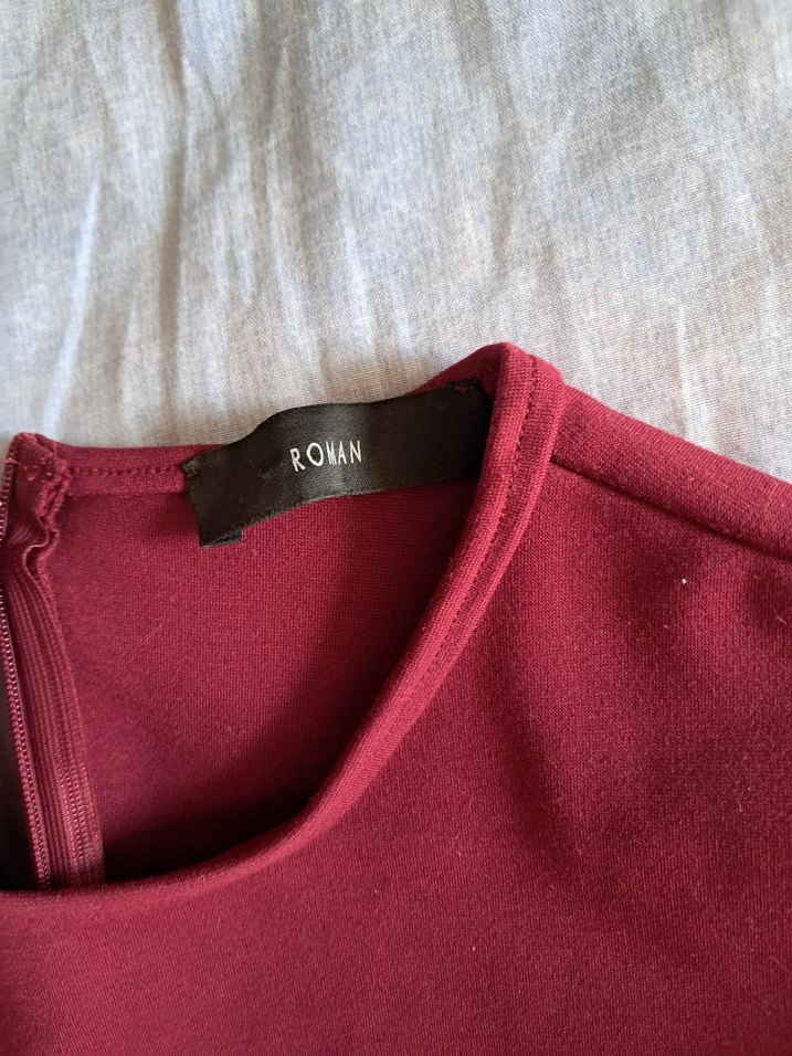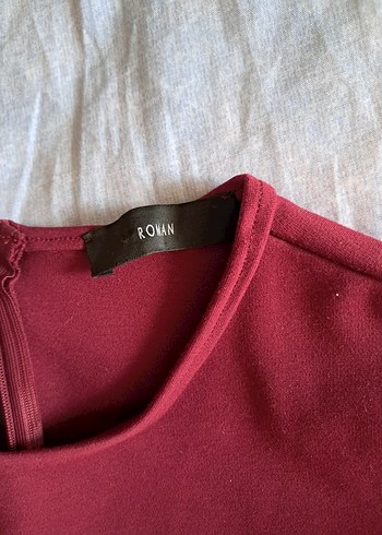 Parlak bordo renkte, yuvarlak yaka ve uzun kollu, normal midi boyda, fermuarlı sırt detaylı, düz ve baskılı minimal desenli kadın elbise Marka Rowan.