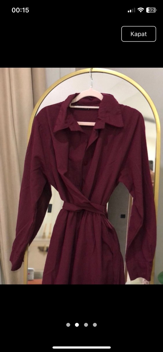Bordo renk, uzun kollu, bol kesim kadın elbisesi. Paris sokak modası tarzında, desensiz ve kuşaklıdır.