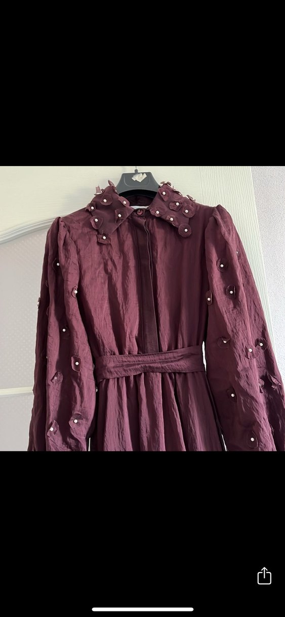 Ürün beden olarak uygun olmadığı için alındığı gün satışa kondu. Hiç giyilmedi. Bordo, yaka kısmı düğmeli ve incili detaylı uzun kollu, yakalı uzun elbise. Bohem tarzda, günlük kullanıma ve özel günlere uygun parlak görünümlü.