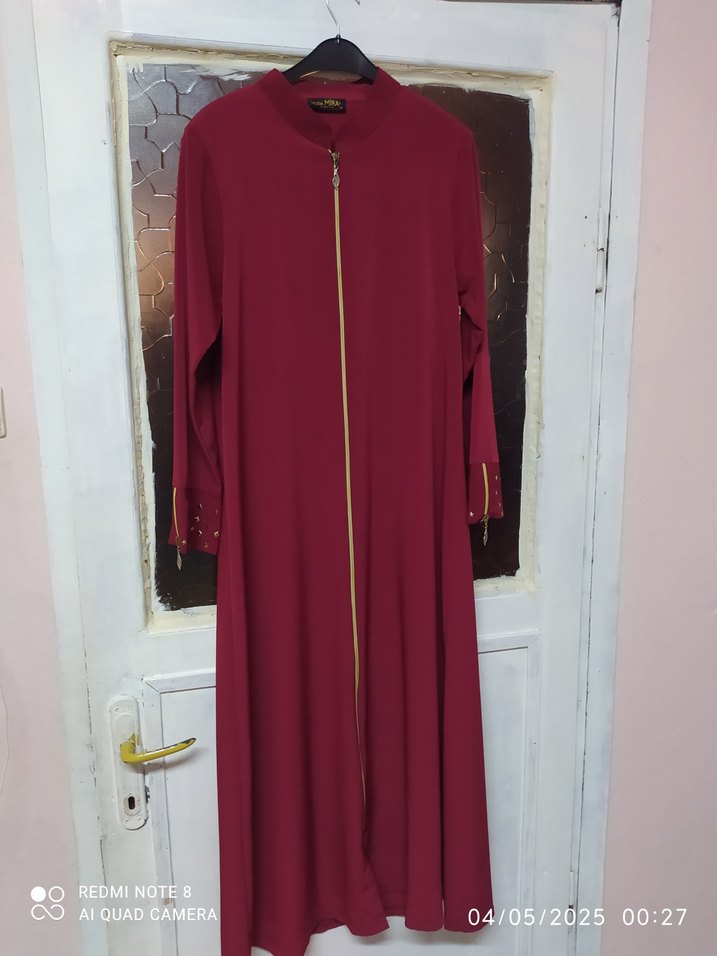 Uzun boy, bordo renkli elbise, yüksek yaka ve ön fermuarlıdır. İpek gibi kumaştan üretilmiş, bol kesim ve uzun kolludur, günlük kullanıma uygundur. ✨
