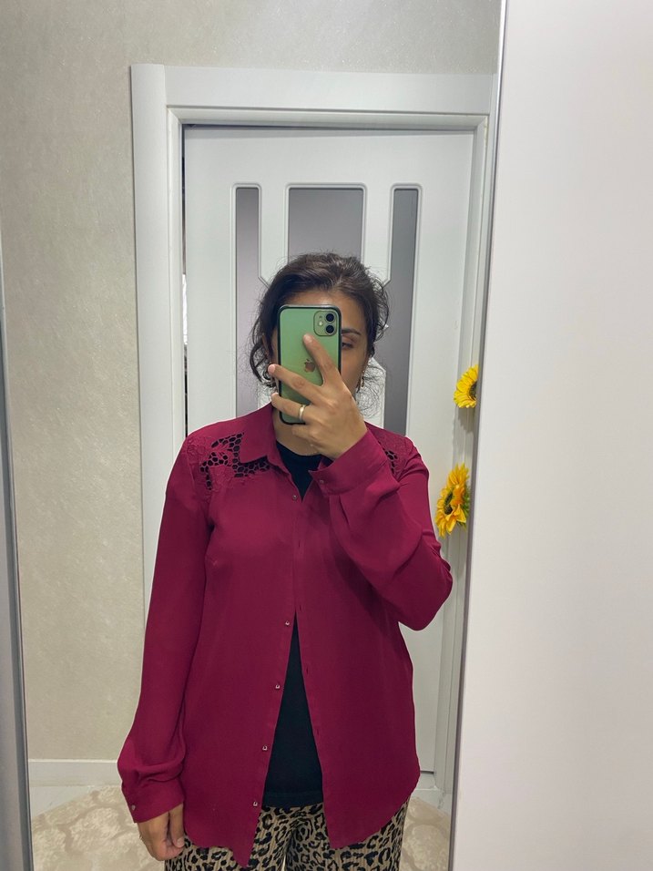 Bordo renkli, uzun kollu, yakalı ve kadın gömlek. İpek gibi yumuşak kumaştan, transparan detaylara sahip, ofis ve günlük kullanıma uygun.