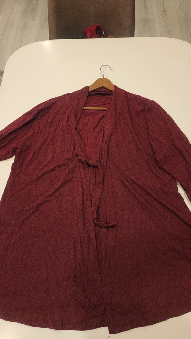 Bordo renkli, uzun kollu ve önden bagcikli hirka rahat bir bohem tarz sunar. Desensiz ve konforludur.