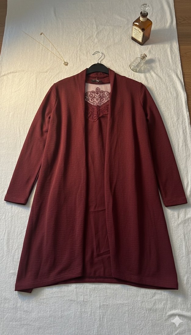 Bordo renkli, uzun kollu ve drapeli tasarıma sahip kaban. Notlu yaka ve rahat kesimiyle klasik ve bohem tarz sunar. Yumuşak, sıcak kumaştan üretilmiştir.