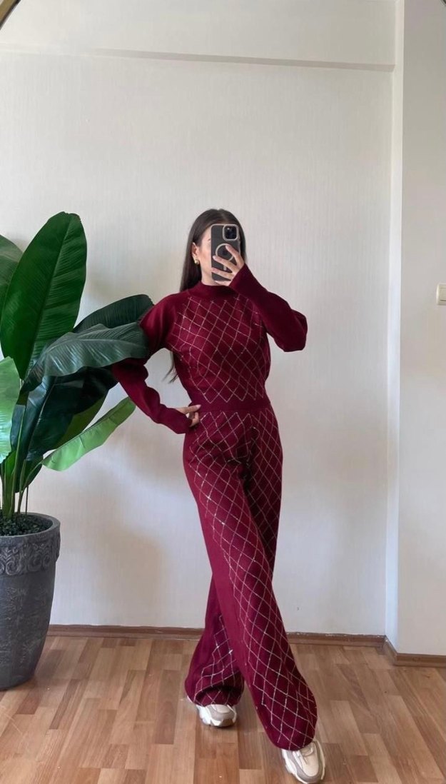 Bordo renkli, uzun kesim ve regular fit ile turtleneck yaka ve uzun kolludur. Koyu tonlu batik desenlidir, günlük kullanıma uygundur.