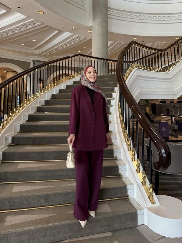 Bordo renkli, uzun kollu, regular fit kadın takım elbisesi. Notched lapel yakalı, desen içermeyen, sade ve şık tasarım.