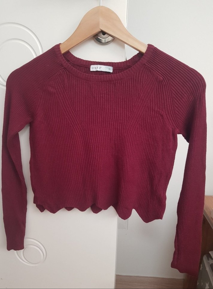 Bordo renkli, uzun kollu, yuvarlak yakalı ve ince triko kumaştan yapılmış, günlük kullanıma uygun sade ve rahat kesim kazak.