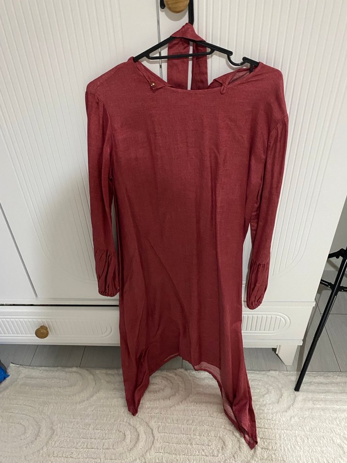 Bordo renkli keten kumaştan, uzun kollu ve bol kesim, drapeli tasarıma sahip minimalist bohem tarzda günlük kadın tunik.