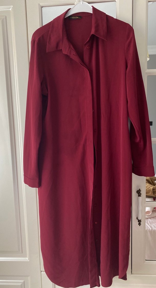 Bordo renkte, uzun kollu ve bol kesim kadın tunik. Medine ipeği kumaş, yakasında kesik yakası ve dökümlü tasarımı ile ofis kullanımına uygun minimal tarzda.122 cm boy 44 beden
