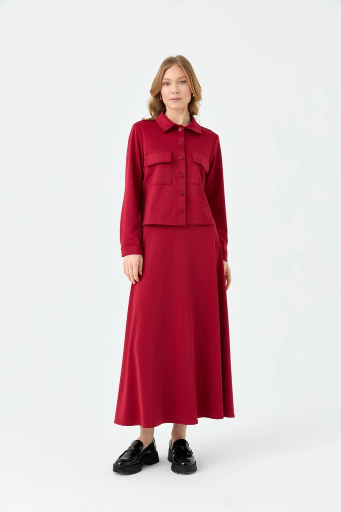 Bordo renkli, uzun kollu ve çıtmalı yaka detaylı bu uzun elbise, sentetik kumaştan yapılmıştır. Normcore ve minimalist tarzıyla ofis için uygundur. Rahat ve şık görünüm sunar.