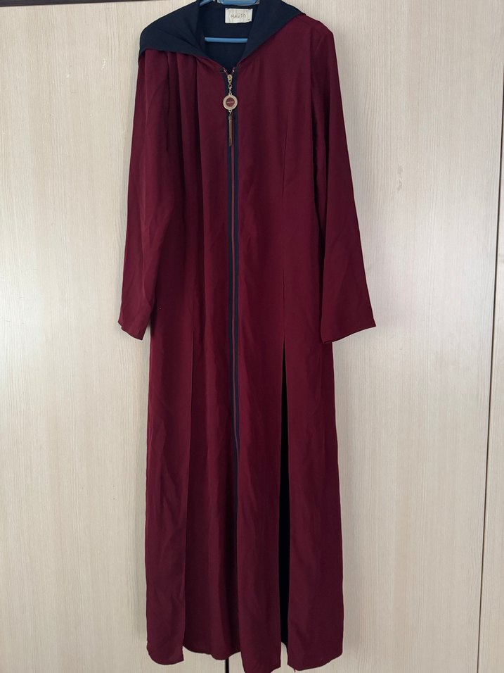 Bordo renkli, uzun kollu, bol kesim kadın uzun ferace . Fermuarlı ve siyah yakalı sade, minimal tasarım.