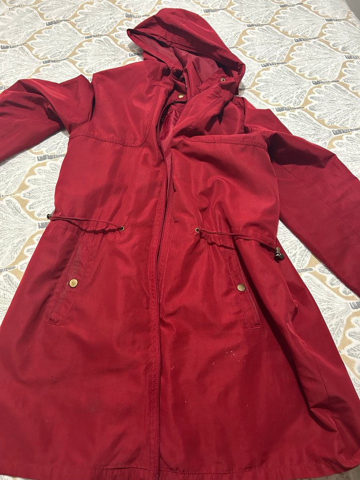 Bordo renkli, parlak ve ipeksi kumaştan uzun kollu, bol kesim kadın yağmurluk. Fermuarlı ve çıtçıtlı cepleri vardır, günlük sokak stiline uygundur. ☔