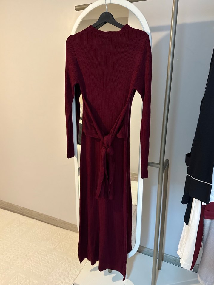 Bordo renginde, uzun kollu ve kemerli, yumuşak sentetik kumaştan yapılmış, modern klasik tarzda, vücuda oturan uzun elbise. Günlük kullanıma uygun, rahat ve şık bir seçenek.