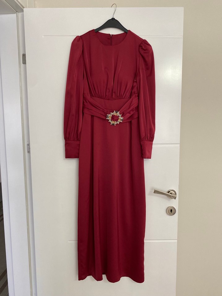 Bordo, uzun kollu, kemerli ve beli işlemeli tokalı uzun elbise. Parlak, ipeksi dokusu ve klasik vintage tarzı ile düğünler için uygun. 42 beden ama dar kesim 38 ,40 bedene uygun Setrms marka