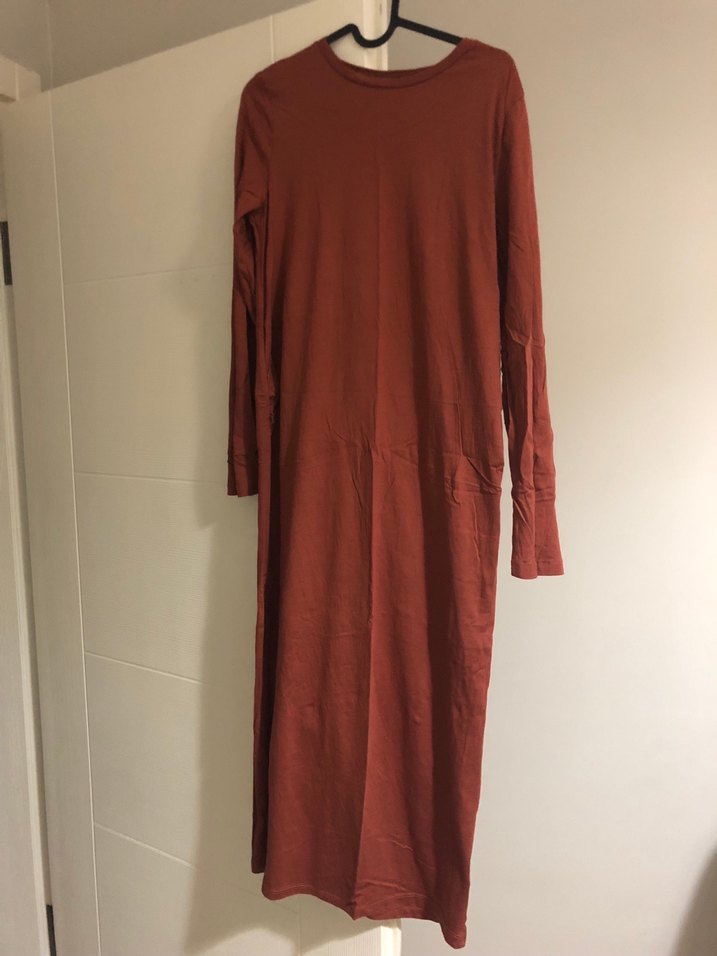 Bordo renkli, keten kumaştan, uzun kollu ve yuvarlak yakalı, bol kesim kadın elbisesi. Minimalist ve normcore tarzda, günlük kullanıma uygundur.