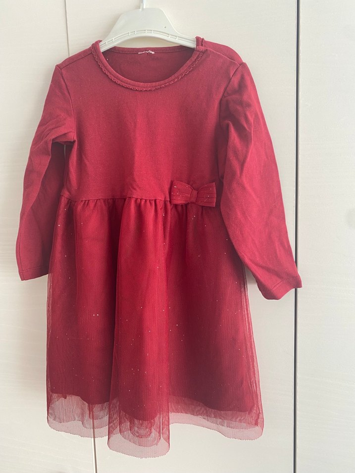 Bordo renkli kız çocuk elbisesi, uzun kollu ve bol kesimdir. Yuvarlak yaka, parlak kumaş ve belde fiyonk detaylı.