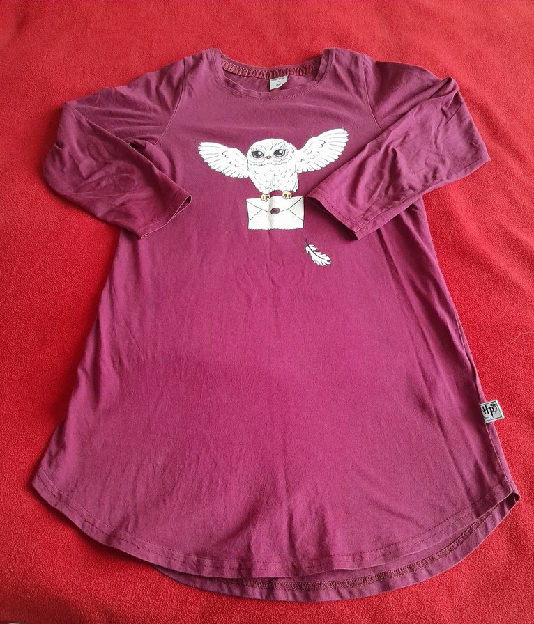 Bordo renkli, uzun kollu kız tişörtü, gevşek kesim ve baskılı baykuş deseni ile. Yuvarlak yakalı, yumuşak örme kumaştan üretilmiştir.