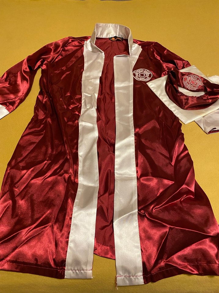 Bordo renkli, uzun kollu, notched lapel yakalı, drapeli ve parlak kumaşlı uzun mezuniyet elbisesi. Parti için uygun, klasik tarzda bir model. Kepte var iade yok