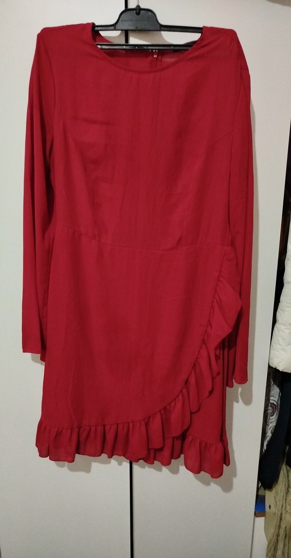 Bordo renkte, uzun kollu ve V yakalı midi elbise. Etek kısmında fırfır detaylarıyla bol ve rahat bir kesime sahiptir. Minimalist bohem tarzıyla romantik akşamlara uygundur.