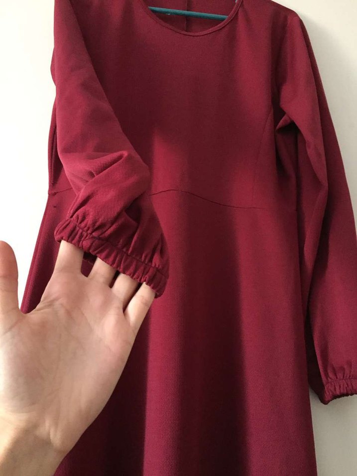 Bordo renkli, yuvarlak yakalı ve uzun kollu, manşetleri fırfırlı midi elbise. Parlak sentetik kumaştan, sade ve fit kesim.