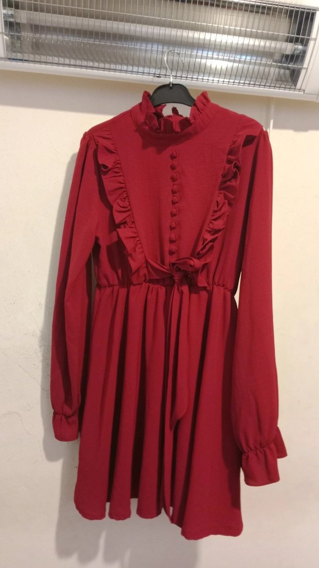Bordo renkli, uzun kollu ve yüksek yakalı midi elbise. Ön ve manşetlerde fırfır detayları, nakışlı desenler ve belde bağlama bulunur. Rahat kesimli, ofis için uygun klasik şıklık sunar. Alt üst takım altı da vardır isteğe göre gönderilir