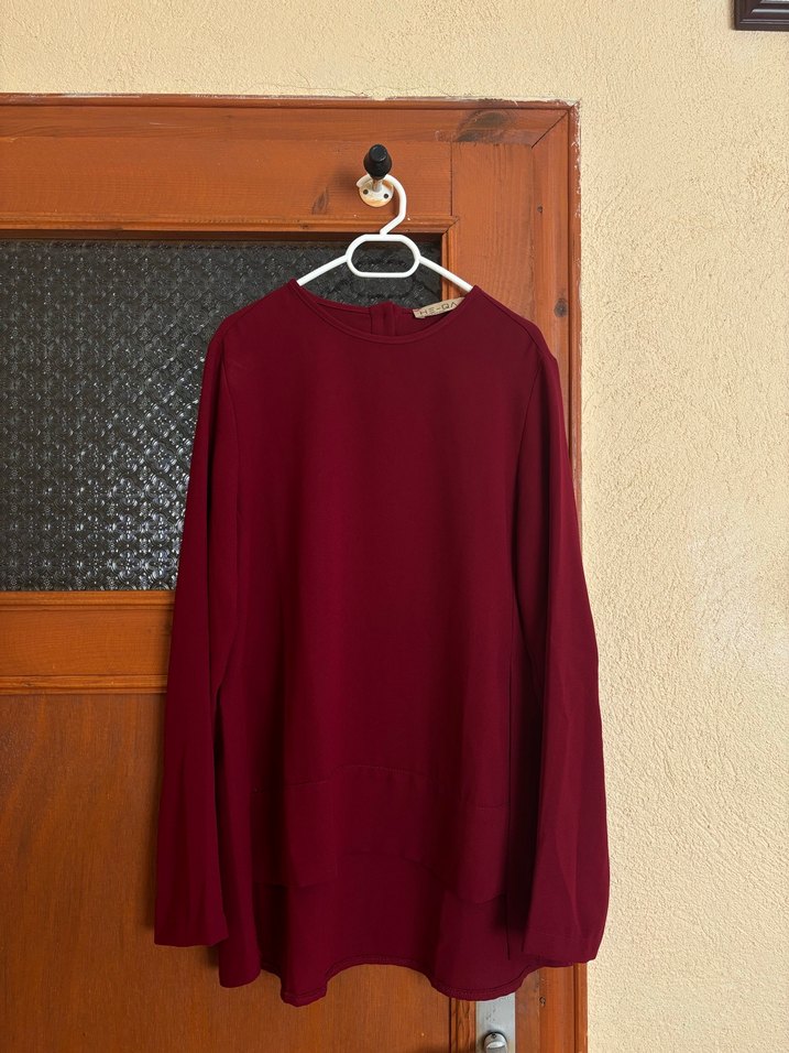 Bordo renkli, uzun kollu ve yuvarlak yakalı kadın tunik. Rahat kesimi ve midi boyuyla, ipeksi dokusuyla günlük kullanıma uygun minimal ve normcore tarzda şık bir parça.