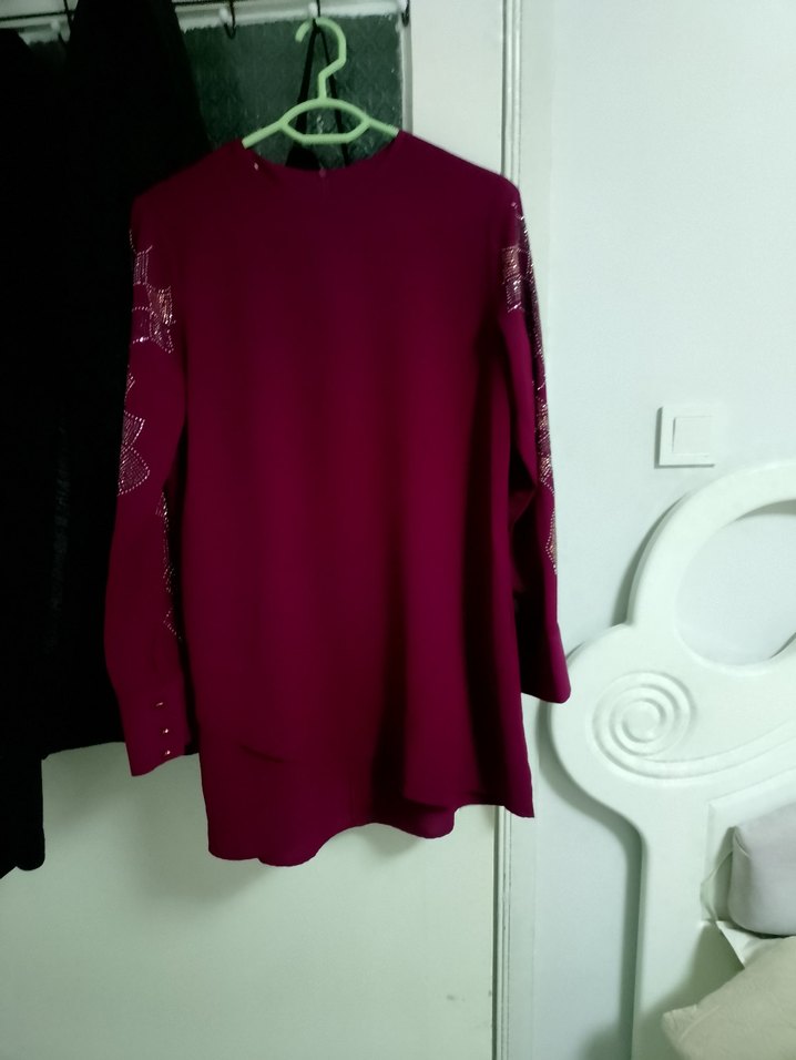 Bordo renk, uzun kollu ve yüksek yakalı bol kesim midi tunik. Sentetik, pürüzsüz kumaştan, drapeli detaylara sahip minimal sokak stilinde. Günlük kullanıma uygun.