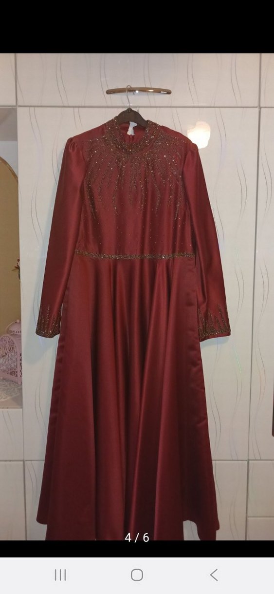 Bordo uzun kollu, yüksek yakalı ve nakış detaylı abiye elbise. Parlak yüzeye sahip, drapeli ve klasik kesimde, düğünler için uygun bir modeldir.