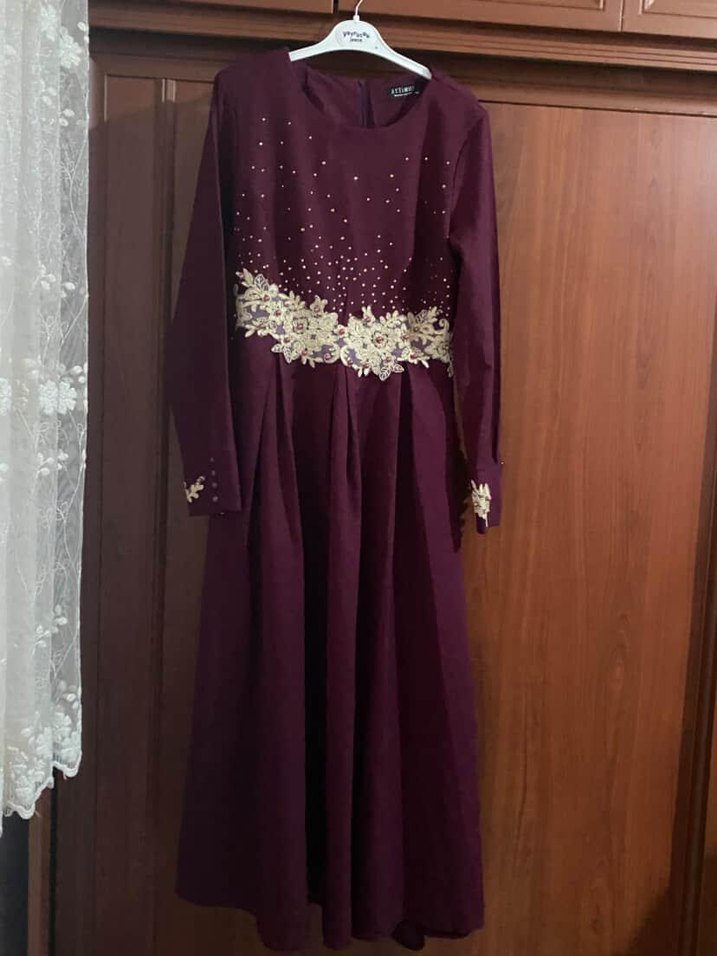 Bordo, Mürdüm Renkli, uzun kollu ve yüksek yakalı abiye elbise. Bel ve kol uçlarında zarif nakış detayları bulunur. Düğünler için uygundur. Tesettüre uygun.
