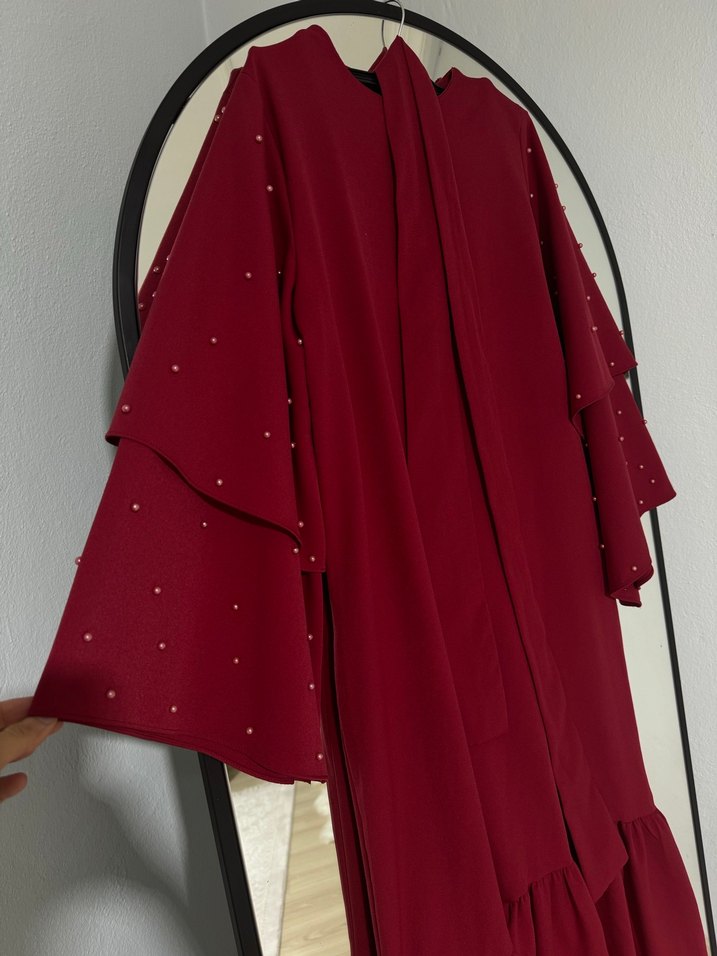 Bordo renkli, uzun kollu, nakışlı desenli ve fırfırlı detaylara sahip bohem tarzda klasik şıklık sunan uzun elbisedir.