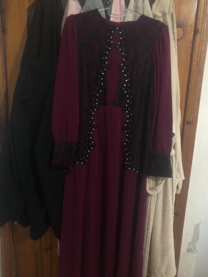 Bordo renkli, yüksek yakalı ve uzun kollu, sentetik kumaştan yapılmış nakış detaylı ve drapeli gotik tarzda dar kesim uzun elbise. Günlük kullanıma uygundur.