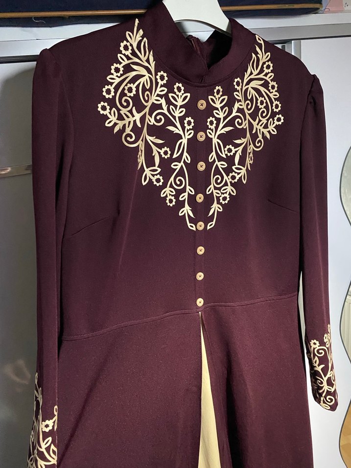 Bordo renkli, düğmeli ve işlemeli vintage tarzda klasik kesim, uzun kollu, yırtmaçlı tesettür bindallı elbisedir. Düğün için uygundur.