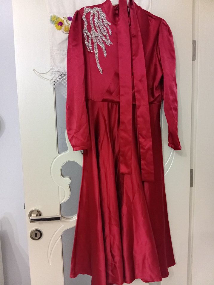 Bordo parlak kumaştan, uzun kollu, yüksek yakalı, nakışlı ve drapeli bol kesim kadın abiyesi. Düğün için uygun şık bir model. tek kusuru uzerindeki taslar yapistirma onlar kalkti