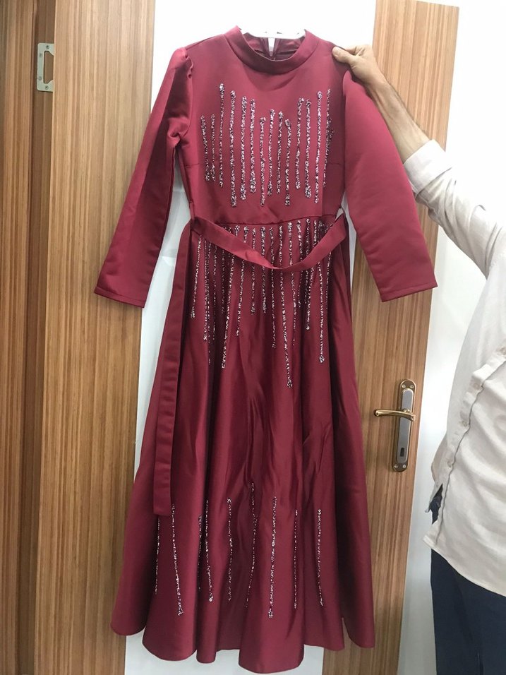 Bordo uzun kollu, yüksek yakalı, nakışlı parlak detaylara sahip abiye. Drapeli, kemerli, düzenli kesim, düğünler için şık bohem tarzda.Sadece 1 kere giyildi şalı hediye
