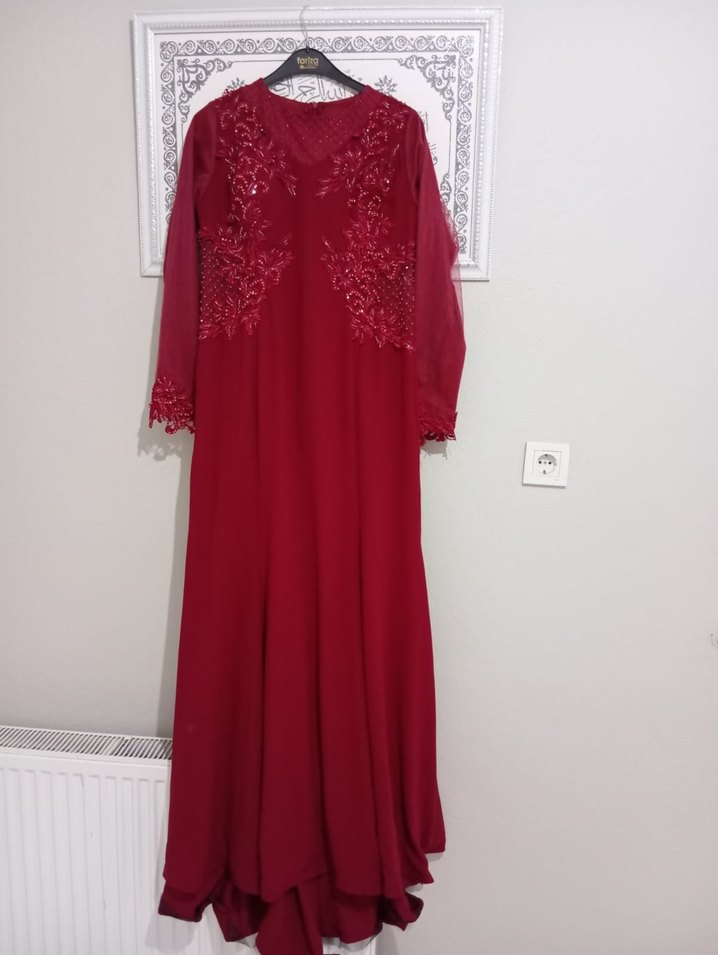 Bordo Uzun Kollu Nakışlı Kadın Abiye