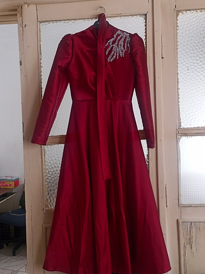 Bordo uzun kollu, yakası kruvaze ve nakış detaylı, parlak dokulu vintage esintili kadın abiyesi, düğünler için uygun. sadece 1 defa giyildi.