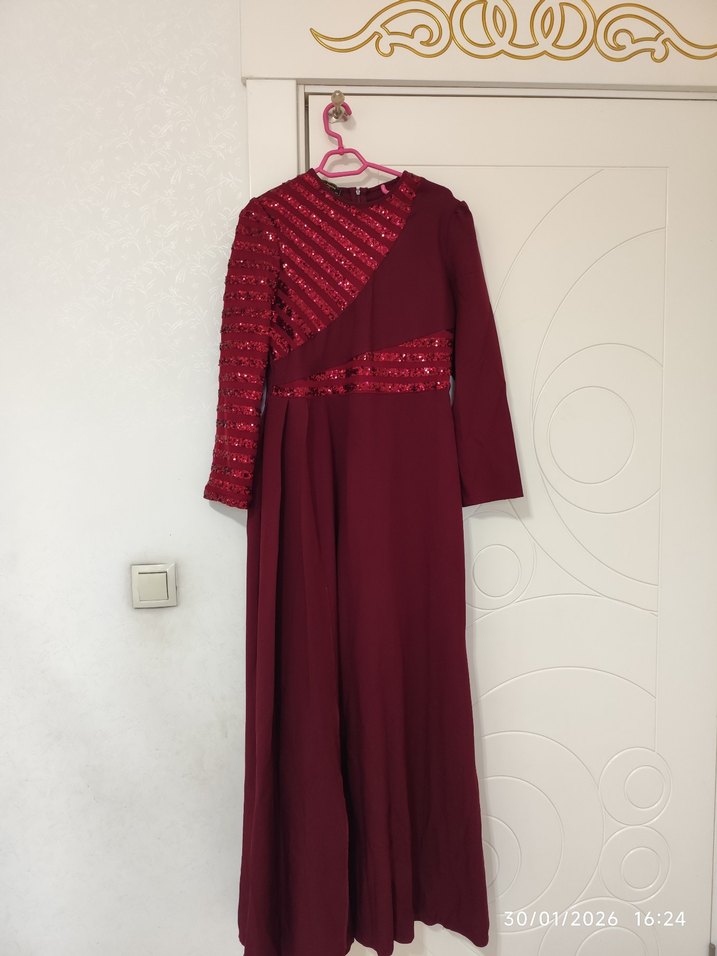 Bordo renkli, uzun kollu, V yaka ve nakışlı detaylara sahip, drapeli kadın abiye elbise. Düğünler için uygun, rahat kesim.