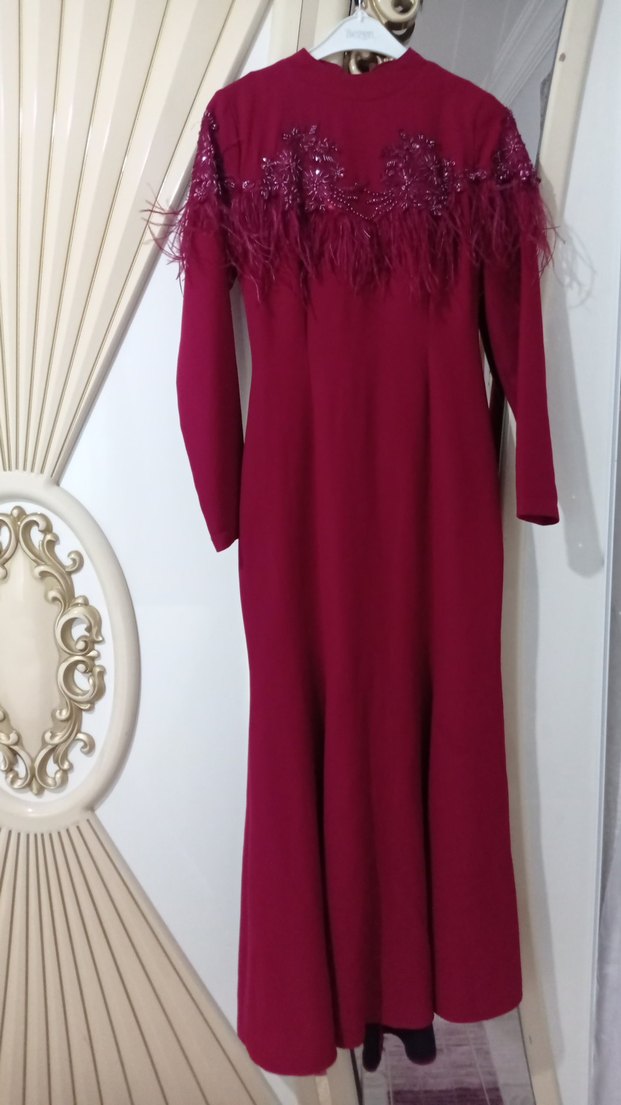 Bordo renkli, uzun kollu ve tekne yaka olan bu dar kesim abiye elbise, tüy ve nakış detaylarıyla modern klasik tarz sunar. Parti için uygun.
