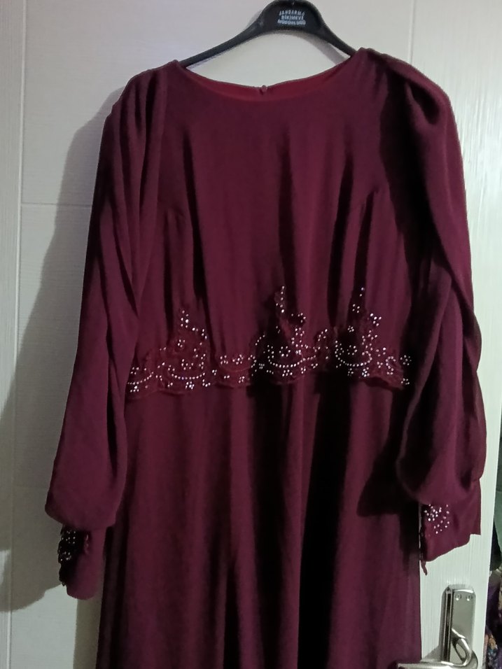 Bordo renkli, uzun kollu, bol kesim abiye elbise. Bel ve manşetlerde nakış detayları bulunur. Yuvarlak yaka ve drapeli tasarıma sahiptir.