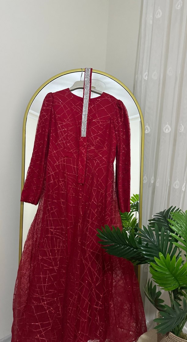 Bordo renkli, uzun kollu ve nakışlı uzun elbise. Düğünler için klasik ve şık bir görünüm sunar, düzenli kesim ve parlak yüzeye sahiptir.