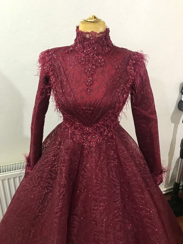 Bordo renkli, vintage tarzda yüksek yakalı ve uzun kollu kadın kına elbisesi. Nakışlı ve kürk detaylıdır, beli oturaklı ve uzun parlak eteğe sahiptir.