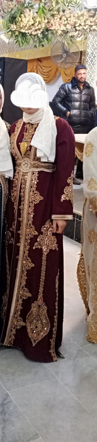 Bordo renkte, uzun kollu kına elbisesi, nakış detayları ve V yaka ile klasik şıklık sunar. Düzenli kesim ve drapeli tasarım düğünlere uygundur.