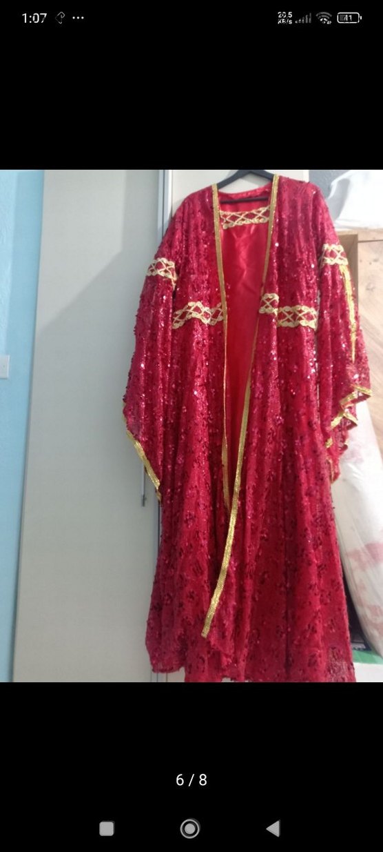 Bordo uzun kollu, V yakalı, nakışlı ve drapeli bohem tarzda bol kesim elbisedir. Parlak dokusuyla düğünler için uygundur. bindallik