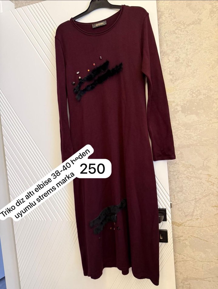 Bordo renkli, uzun kollu ve yuvarlak yakalı triko elbise. Rahat kesimli, sentetik yumuşak kumaştan, nakış detaylı ve günlük kullanıma uygun.