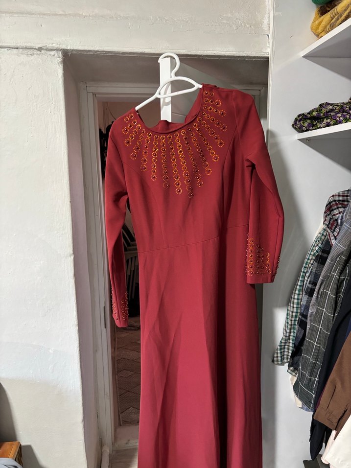 Bordo renkli, uzun kollu, nakış detaylı ve drapeli bu uzun elbise, şık ve sade bohem tarzıyla düğün için uygundur.