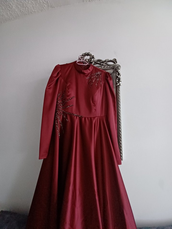 Bordo renk, uzun kollu ve yüksek yakalı bu dar kesim abiye elbise, nakış detayları ve drapeli tasarımıyla vintage gotik tarz sunar.