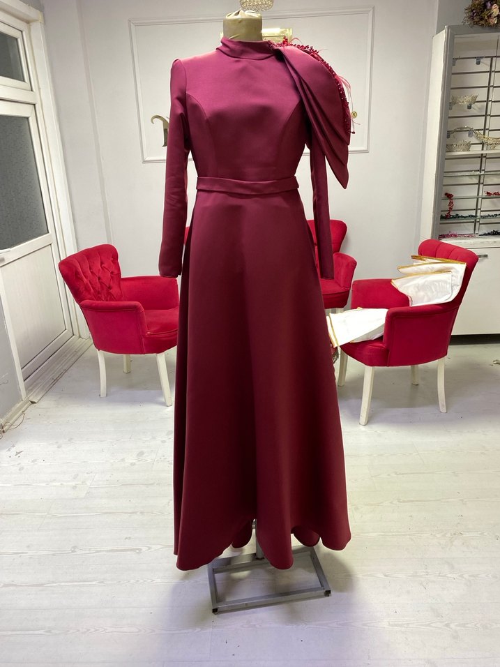 Bordo Uzun Kollu omuz detaylı tasarım elbise