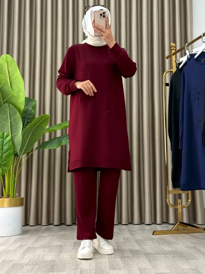 Bedenler mevcut!!! Bordo renkli, pamuklu kumaştan yapılmış, uzun kollu ve yuvarlak yakalı, bol kesim kadın takımı. Minimalist ve mütevazı tarzıyla günlük kullanıma uygun, zahmetsiz şıklık sunar.