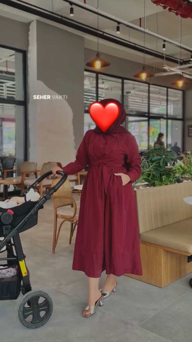 Bordo renkli, yüksek yakalı ve uzun kollu pamuklu kumaştan yapılmış uzun elbise. Salaş kesimi ve drapeli detaylarıyla günlük kullanıma uygundur.